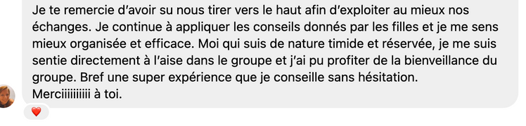 Le groupe est limité à 4 personnes et reste privé afin de créer une safe place pour évoluer ensemble, et permettre un véritable lien d’amitié entre vous.