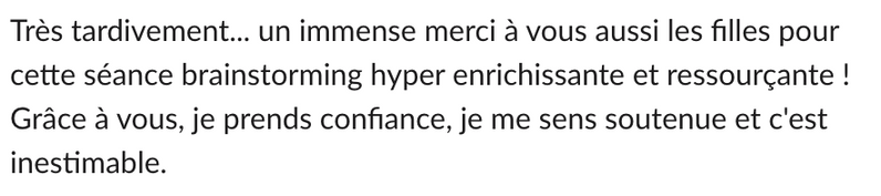 Le groupe est limité à 4 personnes et reste privé afin de créer une safe place pour évoluer ensemble, et permettre un véritable lien d’amitié entre vous.